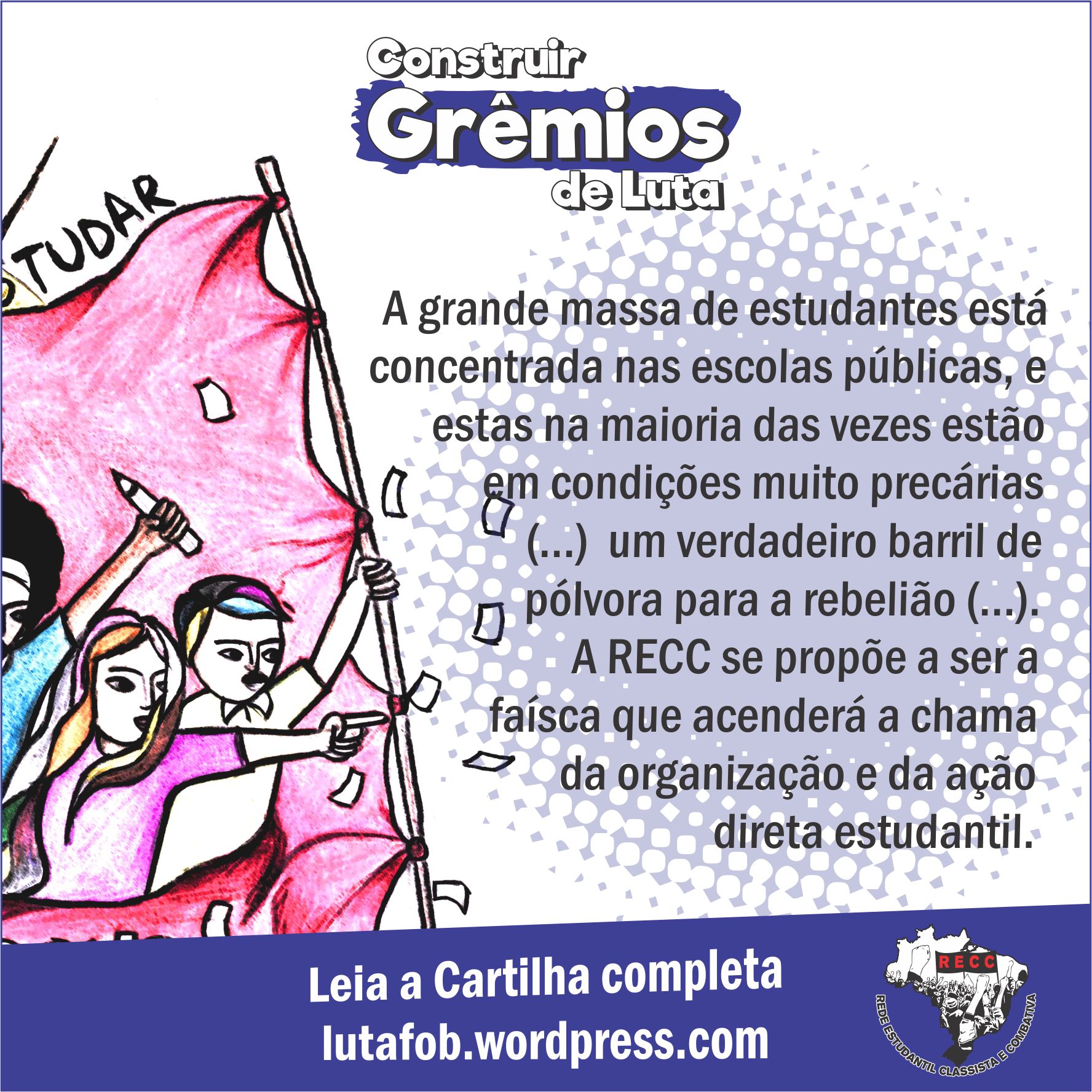 CAPÍTULO 1 – O que é Rede Estudantil Classista e Combativa? CAPÍTULO 2 – O Movimento Estudantil ontem e hoje CAPÍTULO 3 – Avanço do Neoliberalismo no Ensino Básico e a necessidade de um Programa de Lutas CAPÍTULO 4 – O que é o Grêmio Estudantil? CAPÍTULO 5 – Como Construir um Grêmio? Passo a passo CAPÍTULO 6 – Legislação Nacional para Grêmio Estudantil CAPÍTULO 7 – Reorganização pela Base: Democracia, Ação Direta e Unidade com a Classe Trabalhadora CAPÍTULO 8 – Modelo de Estatuto para o Grêmio Estudantil Classista e Combativo