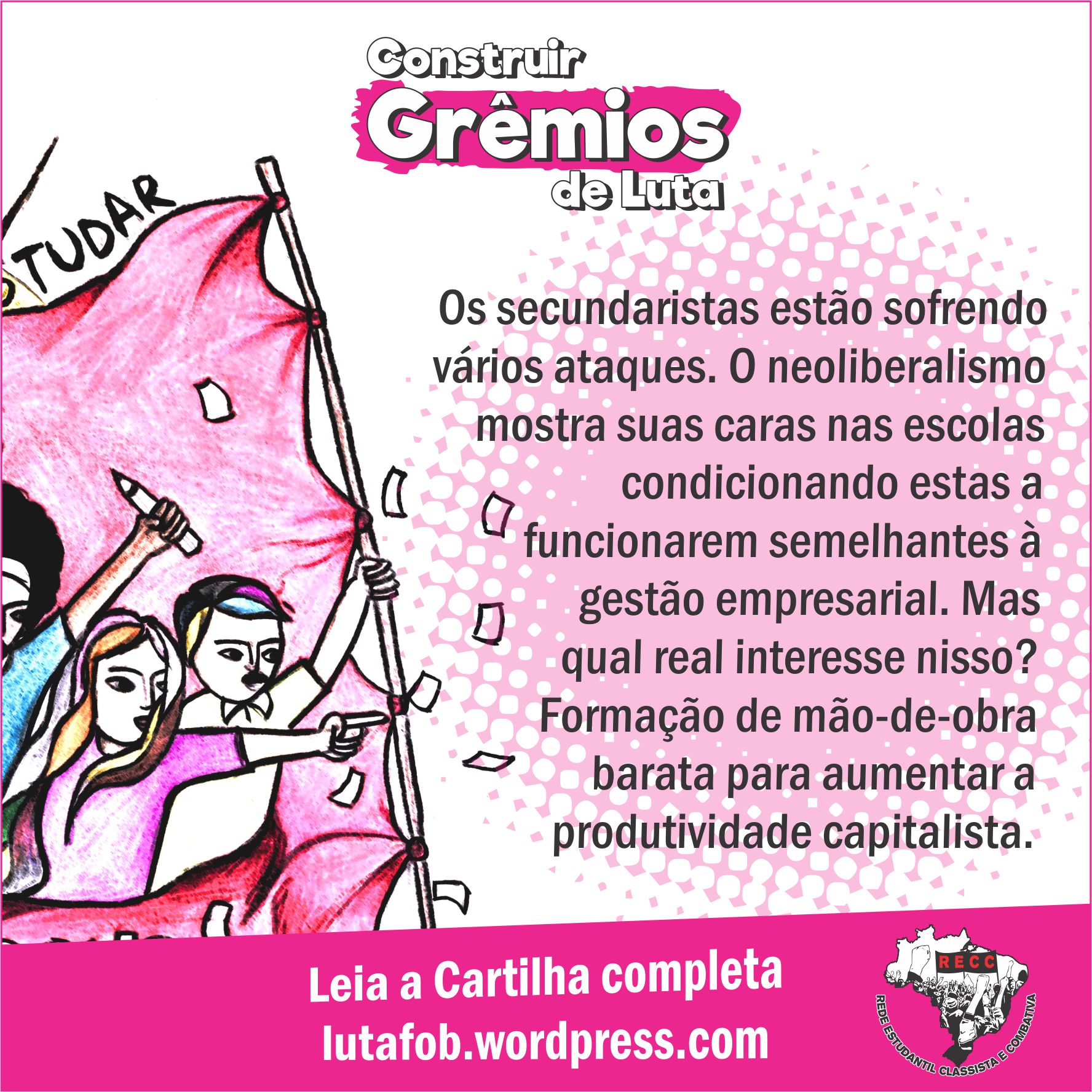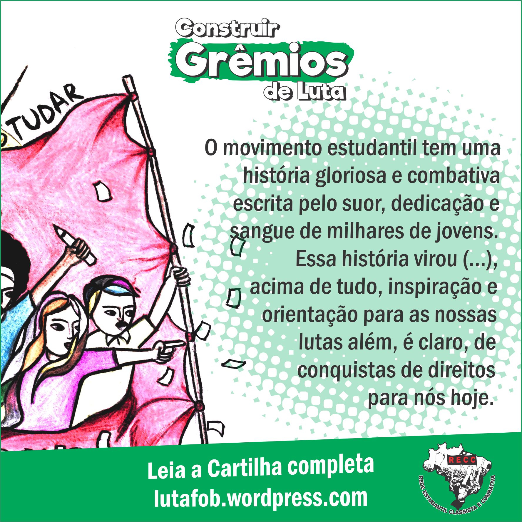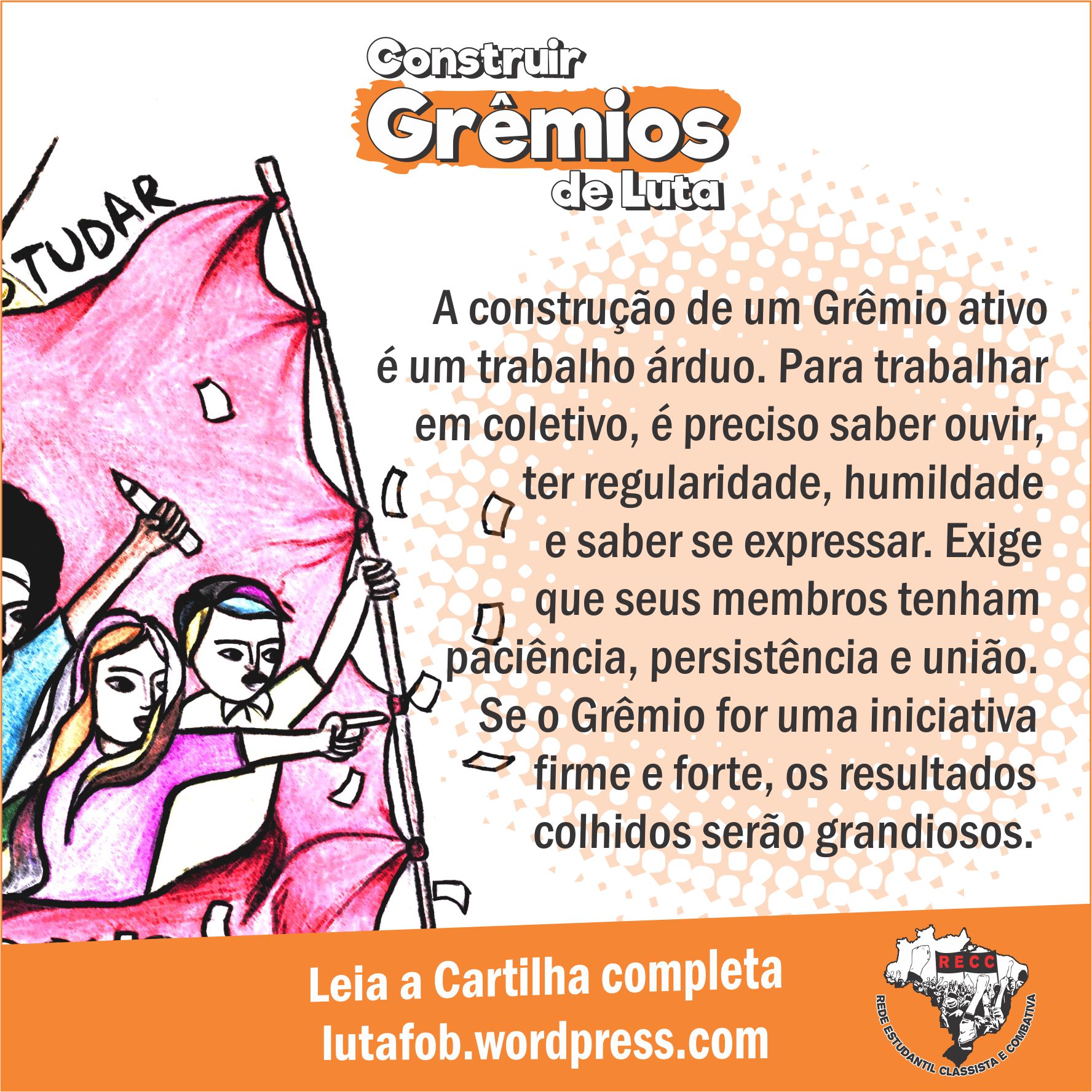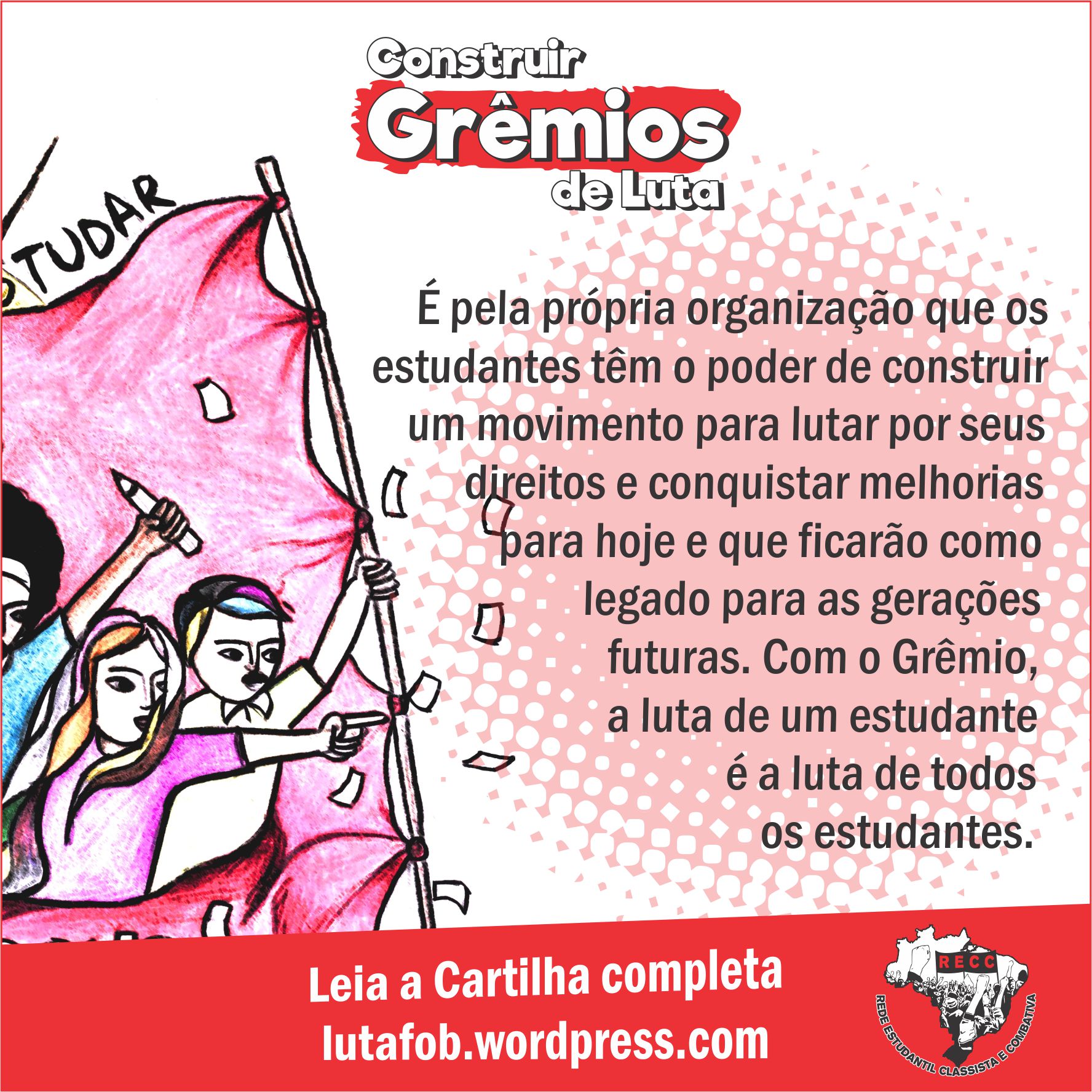 “Muitas vezes os estudantes reclamam de problemas nas escolas, mas por fazerem isso sozinhos, sem organização e de forma envergonhada, estes problemas continuam. (…) São problemas comuns em muitas escolas Brasil afora. E são problemas que afetam a qualidade do nosso ensino, prejudicando nossa formação intelectual, profissional, nosso desenvolvimento físico e como seres humanos. (…) Os estudantes sempre tem algo a dizer e propor para melhorar estas situações. Quando estamos sozinhos, estas ideias podem não fazer diferença, mas organizados em coletivo e de forma unida os estudantes ganham poder. O Grêmio é exatamente a forma de unir os estudantes e fazer ecoar nossa voz. O Grêmio Estudantil é a entidade que representa todos os alunos da escola. Assim como as e os professores possuem seu Sindicato, os estudantes possuem o Grêmio. O Grêmio tem a função de discutir com os estudantes quais são os problemas da escola, do bairro e da educação em geral. E além de debater, deve pensar quais melhorias desejam e como os estudantes farão para conquistá-las. Para isso, o Grêmio pensa em soluções e mobiliza o corpo estudantil para lutar, fazendo com que sua voz seja ouvida e atendida.”
