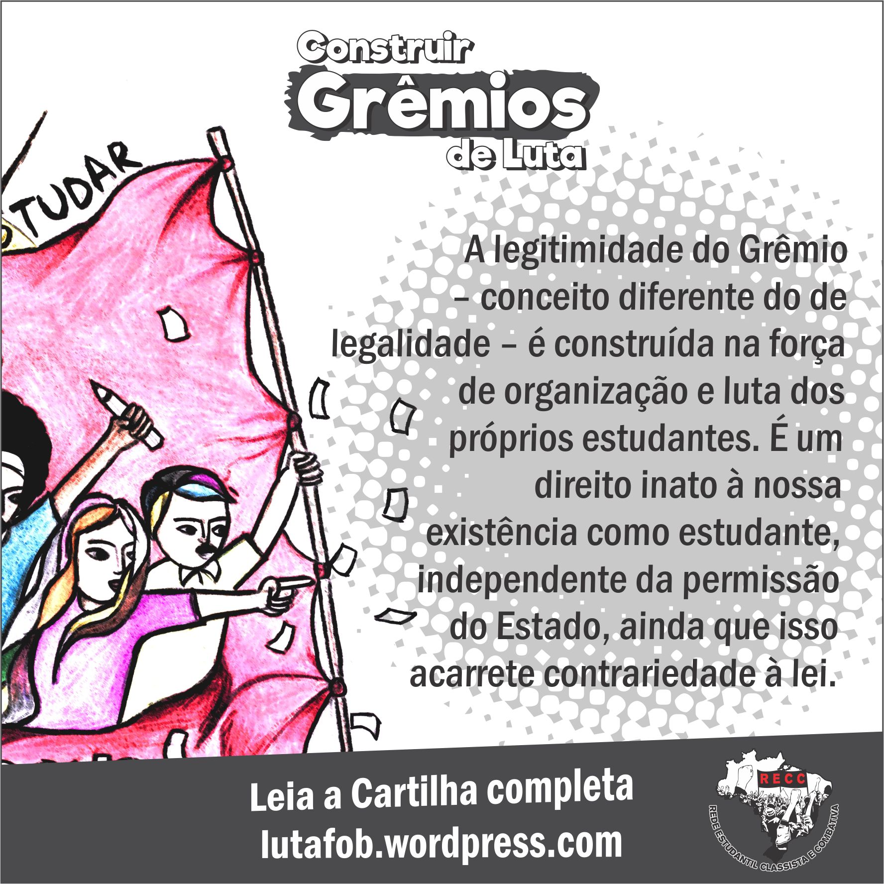 “Lei Nº 7.398/85 e Lei Nº 8.069/90 – Estes são os respaldos legais no nível federal para a garantia de organização de um Grêmio Estudantil. Eles devem ser usados sempre que algum diretor, professor ou agente externo tentar nos retirar o direito de organizar e lutar no Grêmio. Porém, nós da RECC, enquanto uma organização antirreformista, compreendemos que: ainda que estes pressupostos jurídicos não existissem ou caso venham a ser modificados, deturpando e ferindo a autonomia do Movimento Estudantil, devemos continuar intransigentemente a luta através do princípio de nossa legitimidade.”