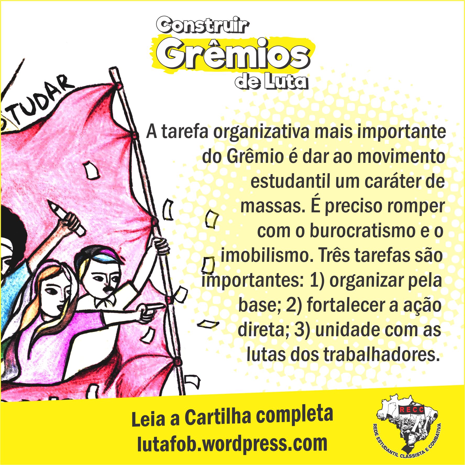 “A reorganização do movimento estudantil deve se dar a partir das bases (de baixo para cima). Ou seja, devemos mobilizar os estudantes, criar autoorganização capaz de mobilizar os estudantes para a ação direta. Essa tarefa se expressa hoje na organização dos estudantes das redes pública e privada em Grêmios e coletivos estudantis. Por isso, nas escolas: devemos fortalecer os Grêmios e sua ligação com os estudantes: 1) garantir a existência regular de assembleias estudantis nas escolas; 2) Fazer das diretorias órgãos colegiados e criar Grupos de Trabalho abertos (com membros eleitos em assembleia) para agregar mais estudantes ao Grêmio; 3) criar Coordenações de Luta Estudantis Regionais (de âmbito municipal ou metropolitano) com plenárias de representantes eleitos nas assembleias nas escolas e uma comissão executiva colegiada.”