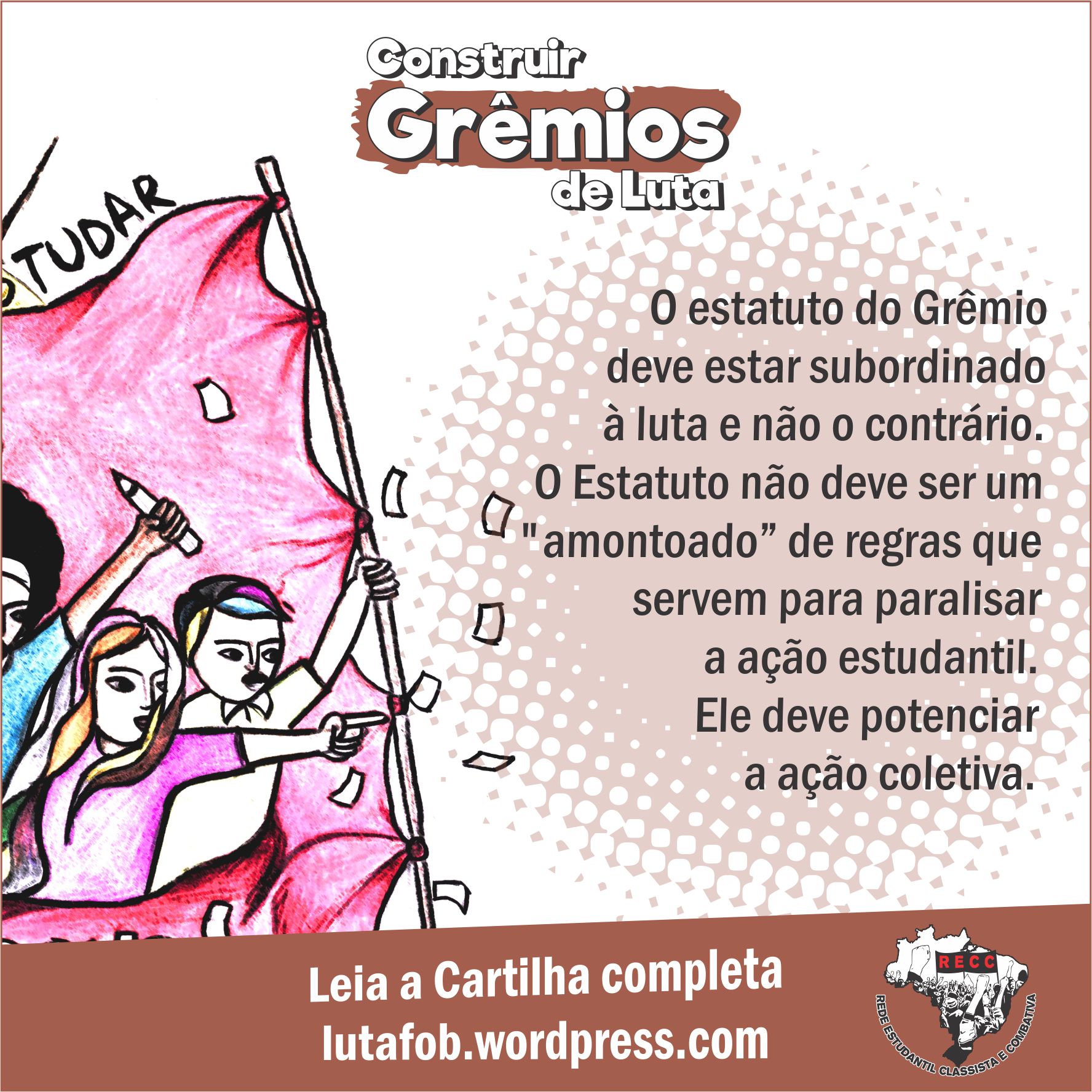 ‘perfeito’ (que não existe) o que fará um Grêmio ativo será a determinação dos estudantes em agir e ‘botar a mão na massa’. Sempre que um Estatuto esteja ‘caduco’, ‘velho’, ele pode e deve ser atualizado pela Assembleia Estudantil para atender as novas demandas de organização e mobilização dos estudantes.”